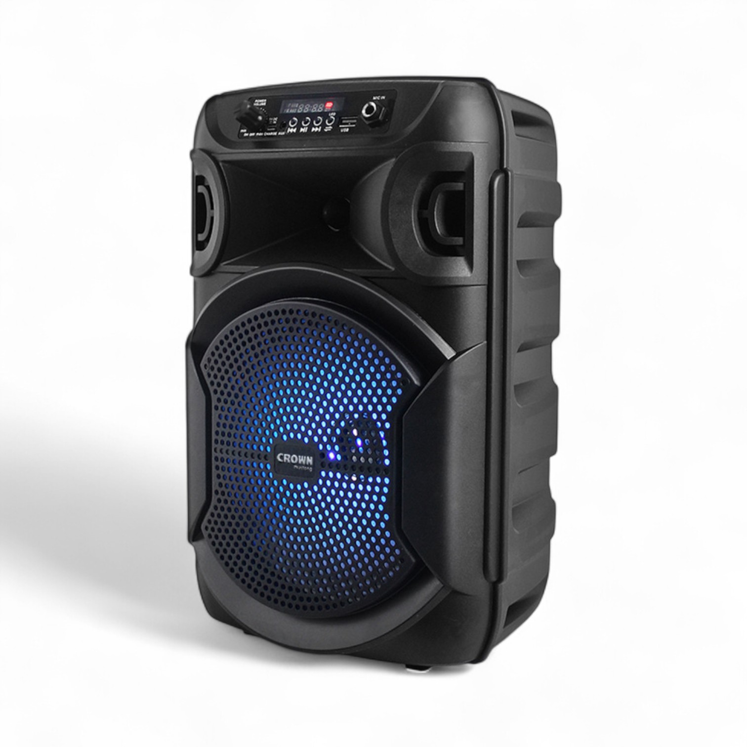 Bafle portátil autoamplificado de 2 vías (woofer 8″ + tweeter 2″), 2 500 W PMPO (~30 W RMS), Bluetooth, entrada auxiliar 3.5 mm, micrófono, disco LED, pantalla LCD, batería interna 5 h, asa y luces LED. Dimensiones: 37×24×20 cm; peso ~1.9 kg Diseñado para ofrecer una experiencia envolvente, PARLANTE CROWN MUSTANG (DJS-820BT) transforma cada reunión en un momento inolvidable.