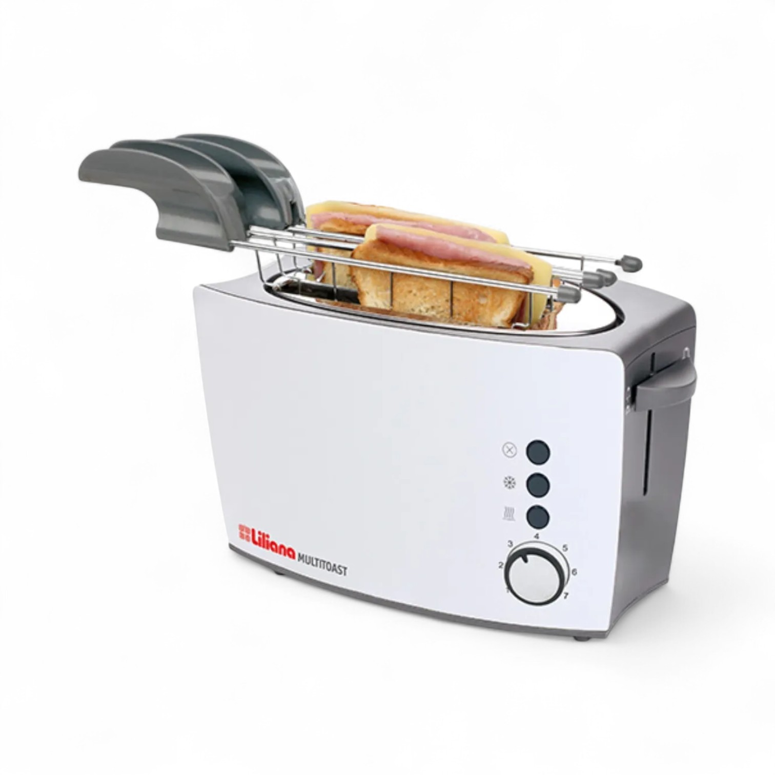 Tostadora eléctrica 2 rebanadas, potencia 800 W, 7 niveles de tostado, funciones tostado, calentar y descongelar; accesorio sandwichero inclusos, bandeja recogemigas. Medidas aprox. 32×22×24 cm, peso ~2 kg. Diseñado para ofrecer una experiencia envolvente, TOSTADORA LILIANA MULTITOAST (AT907) transforma cada reunión en un momento inolvidable.